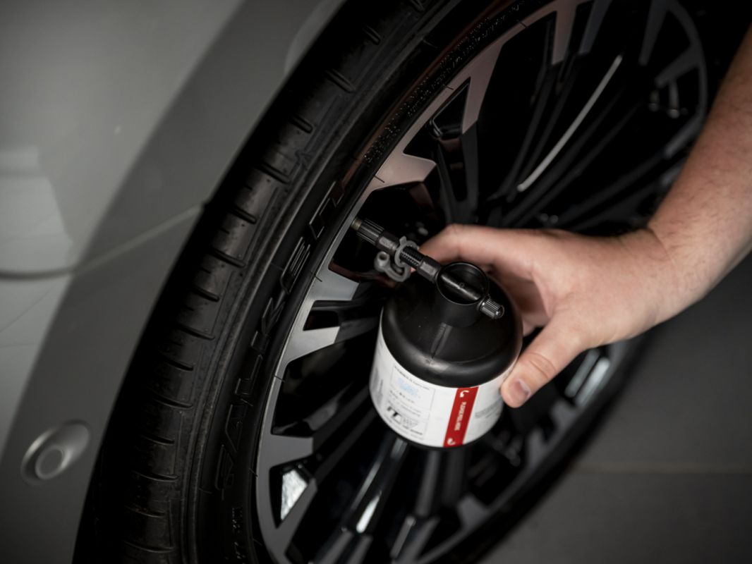 Součástí sady je samozřejmě lepidlo, které použijete jako první. Důležité je, abyste ho na pneumatiku umístili tak, aby jeho lahvička byla v rovné svislé poloze. Možná tedy budete muset s vozem lehce popojet. Během zhruba pěti minut se lepidlo vyprázdní do pneumatiky a díra je zalepena.