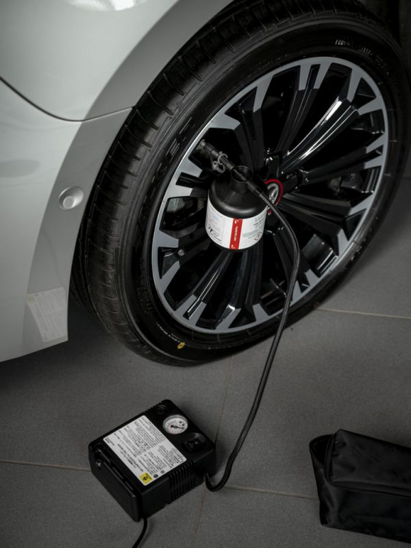V sadě dále najdete ještě kompresor, díky němuž ještě na místě pneumatiky znovu dohustíte na hodnotu tlaku uvedenou v technickém průkazu a můžete vyrazit. Ideálně ovšem rovnou do servisu.