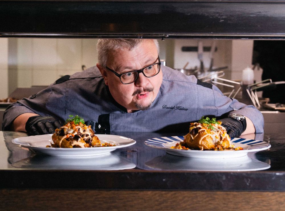 Navrch přichází Blaťácké zlato z Madety, které se při zapékání pomalu rozpouští. Celek stojí na silném BBQ demi-glacé se švestkovými povidly, worcesterskou omáčkou a kořením. Závěr patří domácí majonéze a pikantnímu relish z nakládané zeleniny s koriandrovými semínky. Co dodat „Super hovězí zauzené na buku, pečená velká brambora, Blaťácké zlato, silná omáčka. To je kombinace, která prostě funguje,“ shrnuje s úsměvem David.